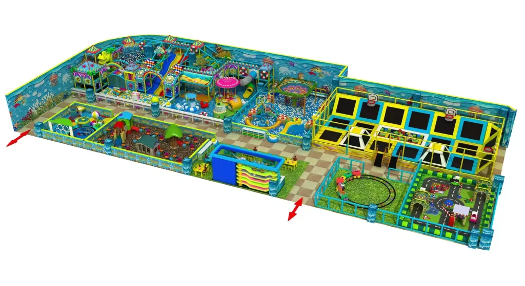 Ball Pit, Slides, Climbing Structures, Trampoline Area, Interactive Play Zones, Playhouses, Mini Car Track, Water Play Area, Obstacle Course, Soft Play Area., etc